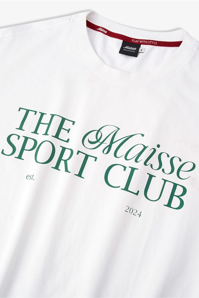 Thiết kế phom dáng rộng rãi (relaxed fit) tạo sự thoải mái tối đa và vẻ ngoài phóng khoáng, phù hợp cho cả nam và nữ (unisex). Điểm nhấn nằm ở họa tiết typography "The Maisse Sport Club" in màu xanh đặc trưng, gợi nhắc đến vẻ đẹp cổ điển và sang trọng của các câu lạc bộ thể thao truyền thống. Sử dụng chất liệu vải cao cấp, mềm mại và thoáng khí, chiếc áo là lựa chọn hoàn hảo để khẳng định cá tính từ sân tập ra phố.